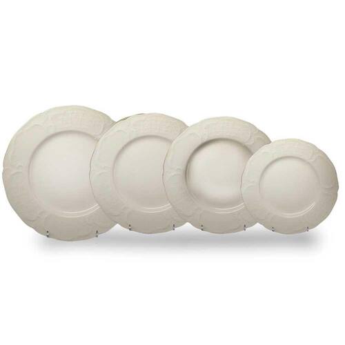 Contém: 6 Pratos De Pão(Dimensões 17 Cm) 6 Pratos Sobremesas(Dimensões 21 Cm) 6 Pratos Fundos(Dimensões 23 Cm) 6 Pratos Rasos(Dimensões 26 Cm) Resistentes, Podendo Colocar Em Máquinas Lava-Louças Sanssouci Quando Frederick O Grande, Teve Seu Novo Castelo Sansoussi Construído Em Potsdam Em 1745, Ele Também Encomendou Acessórios Especiais De Mesa A Ser Construído Para Ele. Arquitetura E Decoração Interior Foram Vistos Como Uma Unidade Inseparável Durante Esse Tempo. É Por Isso Que O Relevo Da Porcelana Sanssouci By Rosenthal Corresponde À Estrutura De Grade Delicada Do Teto Em Estuque De Estilo Rococó Como Encontrado No ?Great Hall At Sanssouci Castle?. Conjunto Desfrutado De Muita Popularidade, Foi Copiado Por Uma Série De Fabricantes Na Época. Mas Somente A Rosenthal Adquiriu A Licença Da Fábrica Real De Porcelana Em 1894, Para Produzir Esse Conjunto Tão Fiel Ao Original. Ele Nunca Foi Alterado E Ainda Hoje Está Em Conformidade Com O Conjunto De Old Fritz.