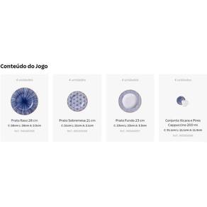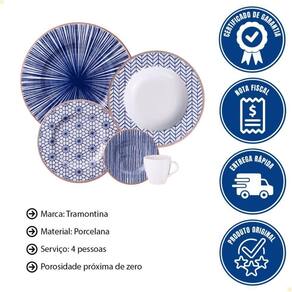 O conjunto é indicado para 4 pessoas, contendo 20 peças: 4 pratos rasos, 4 pratos fundos, 4 pratos de sobremesa, 4 xícaras (200 ml) e 4 pires.