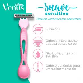 O Gillette Venus Suave Sensitive foi desenvolvido especialmente para cuidado diário feminino, proporciona uma depilação rente e mantém a pele macia com uma só passada. Possui lâminas moveis e cabo emborrachado para uma maior aderência e precisão na hora da depilação. Agora com tecnologia SkinElixir que são fitas lubrificantes umedecidas com um toque de óleo botânico que dão uma depilação suave e protegem a pele. Os aparelhos de depilação descartáveis Venus Suave Sensitive possuem fita lubrificante com tecnologia Skin Elixir para facilitar o deslizamento e ajudá-la a ter uma depilação suave com menos irritação* (vs. Prestobarba2), ideal para peles sensíveis. Sua cabeça móvel se ajusta a suas curvas e suas três lâminas proporcionarão uma depilação rente e maciez por mais tempo* (vs. Prestobarba2). Venus Suave Sensitive é dermatologicamente testada para peles sensíveis. Para uma experiência incrível, use o Gel para Depilação Gillette SatinCare.