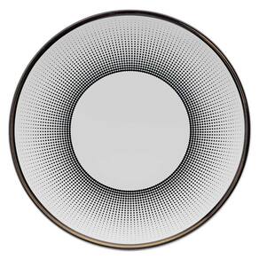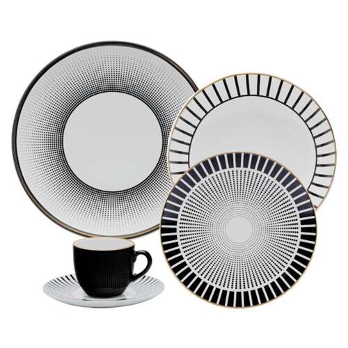 A atemporalidade dos padrões geométricos e a clássica combinação de preto e branco dão vida à moderna decoração Coup Noir. O design minimalista dos pratos é decorado com listras e pontos de diferentes espessuras formando bordas arrojadas para os pratos e pires. Um toque de sofisticação é adicionado através de delicados filetes em ouro que dão o acabamento da coleção