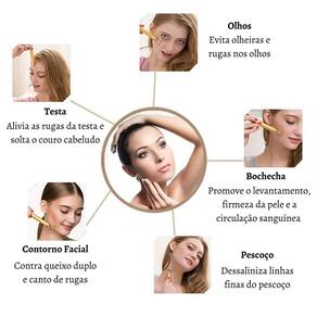 facial efeito harmonização botox anti ruga portátil O facial energy beauty bar te auxilia na prevenção do envelhecimento estimulando a criação do colágeno e reduzindo o volume facial das rugas, olheiras e papada, deixando sua pele com um aspecto mais firme e saudável. Possui um tamanho compacto ideal para levar aonde você for, o design luxuoso na cor dourada metalizada lembra muito a cor do ouro. Especificações: - estimula a produção de colágeno - estimula o preenchimento da pele - estimula a síntese de elastina - melhora as cicatrizes de acne - estimula a hidratação da pele - aparelho a prova d'água - ultrassónico, 6.000 rotações por minuto - tamanho: 14 x 1,6 cm - funciona com 1 pilha aa - cor: dourado Modos de usar: - rosto: faça movimentos ascendente e descendente em todo o rosto. - olhos: faça todo o contorno em volta dos olhos, na questão dos pés de galinhas -movimente o para cima e para baixo. - testa: na testa role em um movimento para cima e para baixo. - linha do sorriso bigode chines : role em um movimento para cima e para baixo. - no pescoço: comece com a base do pescoço e se mova para cima em direção à linha da mandíbula. Repita o mesmo movimento por todo o pescoço. Indicado: recomendamos utilizar o aparelho 3 vezes ao dia durante 3 minutos Itens inclusos: - 01 facial energy beauty bar - 01 case de armazenamento - 01 pilha aa Marca: Não Informado
