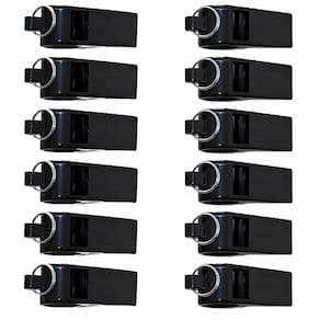 Detalhes:Possui anel de fixação (argolinha) em sua ponta.Som agudoRequer esforço mínimo para apitar.Possui bolinha fabricada em cortiçaDimensão do produto: 4,5 x 1,6 cm (comprimento x largura).Cor: PretoContém: 12 unidades.