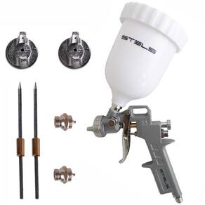 Aplicador de pintura pneumática com tanque alto e alimentação por gravidade, indicada para aplicação protetora em diversas superfícies, como: plástico, metal, madeira e cerâmica. Produzida em liga de alumínio fundido, conta com sistema de regulação, circulação de ar e pressão. Ideal para a realização de trabalhos internos e externos, em oficinas de reparação de automóveis.