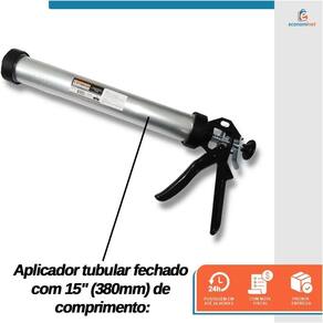 Características: Aplicador tubular fechado com 15 380mm de comprimento: Proporciona maior alcance e controle durante a aplicação, garantindo precisão mesmo em áreas de difícil acesso. Compatível com sachês de até 600ml: Versatilidade para atender às suas necessidades, seja em projetos pequenos ou de grande porte. Corpo em aço carbono e alumínio: Resistência e durabilidade excepcionais, suportando o uso frequente e prolongado sem comprometer o desempenho. Acompanha bico plástico: Pronto para uso imediato, com bico versátil para diferentes tipos de aplicações. Ideal para aplicação de materiais de vedação: Vedação de juntas, trincas, rodapés, calhas, pias, aquários, portas, janelas e muito mais.