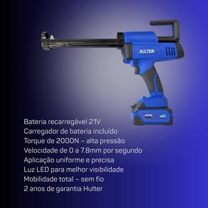 Com velocidade ajustável até 7,8 mm por segundo e controle de velocidade variável com 6 níveis, o aplicador oferece ajuste fino conforme a necessidade do serviço. O gatilho com acionamento progressivo garante maior sensibilidade durante o uso, proporcionando aplicação uniforme e precisa em cartuchos de silicone e adesivos. Além disso, conta com sistema com haste de êmbolo reforçada, que assegura resistência e durabilidade, e luz LED integrada, facilitando o trabalho em ambientes com pouca iluminação.