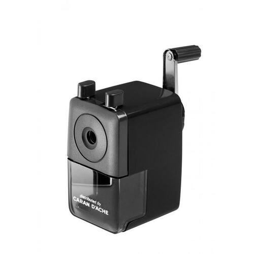 Apontador Caran d'Ache, modelo em plástico disponível nas cores: preto, azul e vermelho. Precisão e sutileza para lápis com linhas limpas e exatas. Para lápis redondos, hexagonais e triangulares com um diâmetro de 4 a 8 mm. Acompanha acessório de fixação na mesa de trabalho. Desenvolvido na Suíça.