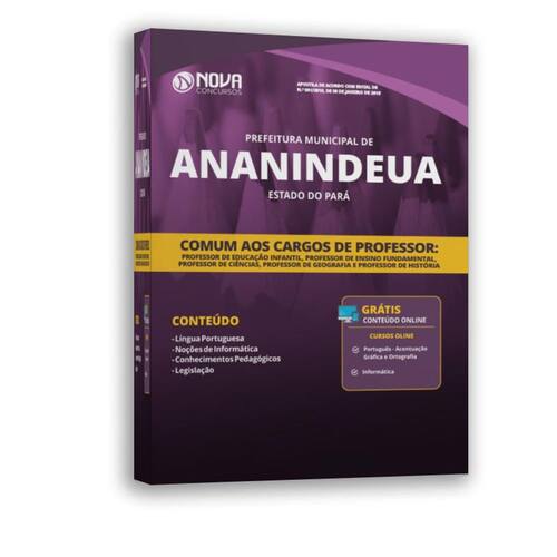 - Uma Apostila Impressa Prefeitura de Ananindeua - PA - 2019 - Comum aos cargos de Professor, - Um Curso Online de Português - Acentuação Gráfica e Ortografia, - Um Curso Online de Informática. Seguintes cargos: - Professor de Educação Infantil, - Professor de Ensino Fundamental, - Professor de Ciências, - Professor de Geografia, - Professor de História. A Apostila Prefeitura de Ananindeua - PA 2019 - Comum aos Cargos de Professor foi elaborada de acordo com o edital 001/2019, por professores especializados em cada matéria e com larga experiência em concursos.