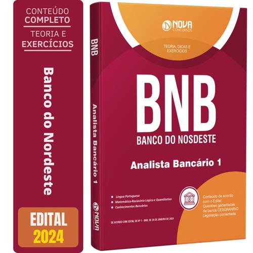 A apostila bnb - banco do nordeste - analista bancário 1 apresenta conteúdo completo e atualizado, de acordo com o edital nº 1 - bnb, de 26 de janeiro de 2024.