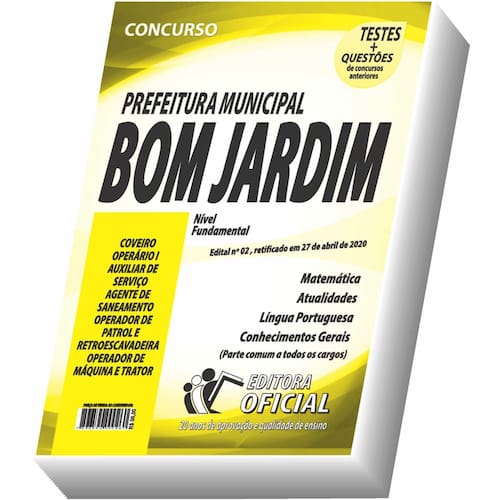 Edição impressa atualizada - elaborada por professores especializados em concursos públicos do curso oficial - são 20 anos de experiência e aprovação dedicados a você, . Cargos: coveiro - operário i - auxiliar de serviço - agente de saneamento - operador de patrol e retroescavadeira - operador de máquina e trator Tipo: impressa Páginas: 200 Escolaridade: ensino fundamental incompleto Órgão: prefeitura municipal de bom jardim - mg - edital nº 02/2020 Conteúdo do material: Matemática Atualidades Língua portuguesa Conhecimentos gerais Você receberá ainda: Testes, provas e questões de concursos anteriores; Atualizações, se houver alguma mudança no edital; Prova do último concurso; Edital do concurso