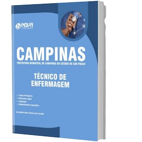 Apostila Concurso Campinas SP Técnico em Enfermagem Apostila para Concurso Prefeitura de Campinas - SP 2022 para o cargo de Técnico em Enfermagem -002ma-22-prefeitura-campinas-tec-enf-imp Concurso da Prefeitura de Campinas Características do Produto - Formato: Impressa Papel A4 - Marca: Nova Concursos - Autor: Professores Especializados - Modelo: Livro Brochura - Medidas 21x29cm - Quantidade de Páginas: 234 - Edição: Maio/2022 A Apostila Concurso Prefeitura de Campinas - SP 2022 - Técnico em Enfermagem contempla as seguintes matérias: Língua Portuguesa Raciocínio Lógico Legislação Conhecimentos Específicos 234 Páginas