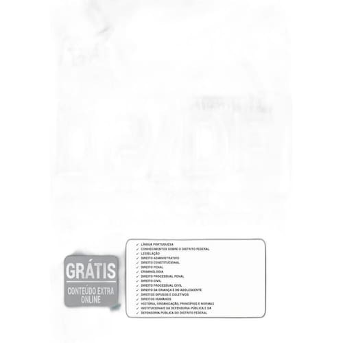 Língua Portuguesa Conhecimentos sobre o Distrito Federal Legislação Direito Administrativo Direito Constitucional Direito Penal Criminologia Direito Processual Penal Direito Civil Direito Processual Civil Direito da Criança e do Adolescente Direito do Consumidor Direitos Difusos e Coletivos Direitos Humanos História, Organização, Princípios e Normas Institucionais da Defensoria Pública e da Defensoria Pública do Distrito Federal