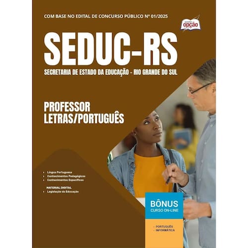 Apostila Concurso SEDUC RS 2025 - Professor - Letras/Português Apostila SEDUC-RS 2025 - Professor - Letras/Português Concurso Secretaria de Estado da Educação do Rio Grande do Sul - SEDUC-RS Apostila SEDUC RS rigorosamente elaborada de Conteúdo com o edital oficial Nº 01/2025; OP-022JL-25-SEDUC-RS-PROF-PORT-IMP Você pode imaginar como a sua Vida vai Melhorar depois que você Conquistar a Aprovação neste Concurso Púbico Pois é, se você se preparar, será Aprovado a e se tornará um a Funcionário a Público a e, isso lhe trará a tão sonhada Estabilidade Profissional e Financeira que tantos almejam. Esta Apostila lhe ajudará nesta caminhada, pois, ela é elaborada conforme o Edital e por Professores especialistas em cada matéria e na banca do concurso. Características do Produto - Formato: Impressa Papel A4 - Marca: Apostilas Opção - Autor: Professores Especializados - Modelo: Livro Brochura - Medidas 21x29cm - Quantidade de Páginas: 142 - Ano de Publicação: Julho / 2025 A Apostila Secretaria de Estado da Educação do Rio Grande do Sul 2025 - Professor - Letras/Português foi organizada para proporcionar um melhor rendimento na sua preparação, abordando cada conteúdo de forma objetiva e direcionada. Estude para o Concurso da Secretaria de Estado da Educação do Rio Grande do Sul 2025 com um material de acordo com o Edital oficial para o cargo de Professor - Letras/Português. Características - Conteúdo de acordo com o edital oficial Nº 01/2025; - Material produzido por equipe especializada em concursos públicos; Matérias da Apostila: Língua Portuguesa Conhecimentos Pedagógicos Conhecimentos Específicos : Legislação da Educação Marca: Não Informado