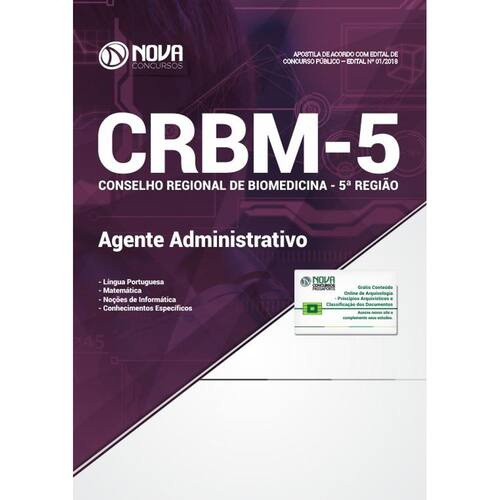 A Apostila CRBM 5 Região 2018 - Agente Administrativo foi elaborada de acordo com o Edital 01/2018 do concurso, por professores especializados em cada matéria e com larga experiência em concursos.