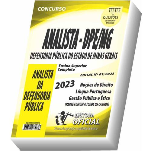Edição Impressa Atualizada – Elaborada por professores especializados em concursos Públicos do Curso Oficial – São 23 anos de experiência e aprovação dedicados a você, candidato.Cargo: ANALISTA DA DEFENSORIA PÚBLICATipo: IMPRESSAPáginas: 266Escolaridade: Nível Superior CompletoÓrgão: DEFENSORIA PÚBLICA DO ESTADO DE MINAS GERAIS - Edital nº 01/2023Conteúdo do Material:NOÇÕES DE DIREITOLÍNGUA PORTUGUESAGESTÃO PÚBLICA E ÉTICAVOCÊ RECEBERÁ AINDA:Testes, provas e questões de concursos anteriores;Atualizações, se houver alguma mudança no edital;Prova do último concurso;Edital do Concurso. Ean: 7898682129248