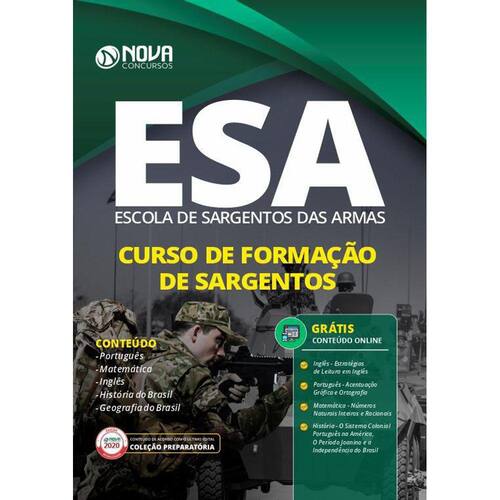 Apostila para Concurso ESA 2020 para o cargo de Curso de Formação de Sargentos Você pode imaginar como a sua Vida vai Melhorar depois que você Conquistar a Aprovação neste Concurso Púbico Pois é, mais cedo ou mais tarde, você será Aprovado a e se tornará um Funcionário Público e, isso lhe trará a tão sonhada Estabilidade Profissional e Financeira que tantos almejam. Esta apostila lhe ajudará nesta caminhada, pois, ela é elaborada conforme o Edital. Características do Produto - Formato: Impressa Papel A4 - Marca: Nova Concursos- Autor: Professores Especializados- Modelo: Livro Brochura - Medidas 21x29cm- Quantidade de Páginas: 440- Ano de Publicação: 2020 A Apostila Concurso ESA 2020 - Curso de Formação de Sargentos Contempla as seguintes matérias: Língua PortuguesaMatemáticaInglêsHistória do BrasilGeografia do Brasil 440 Páginas - Está incluso com a Apostila: Curso Online de Inglês - Estratégias de Leitura em Inglês Bônus , Curso Online de Português - Ortografia e Acentuação Gráfica Bônus , Curso Online de Matemática - Números Naturais Inteiros e Racionais Bônus , Curso Online de História - História do Brasil - Alguns Tópicos Bônus