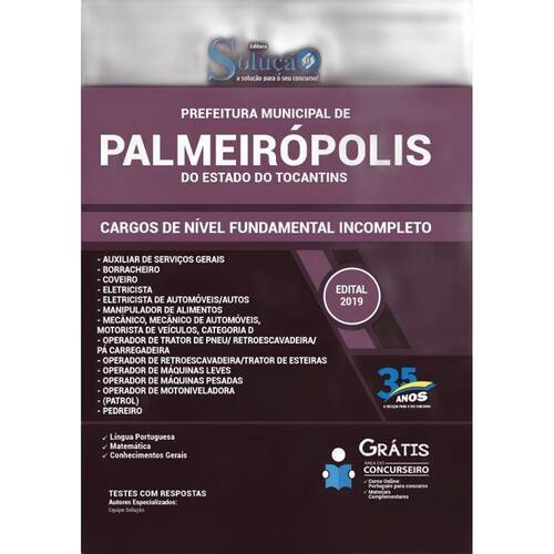 A Apostila para Comum aos Cargos de Nível Fundamental Incompleto do concurso Prefeitura de Palmeirópolis - TO 2019 foi rigorosamente elaborada conforme o edital, o que torna o seu conteúdo completo e atualizado. Marca: Editora Solucao