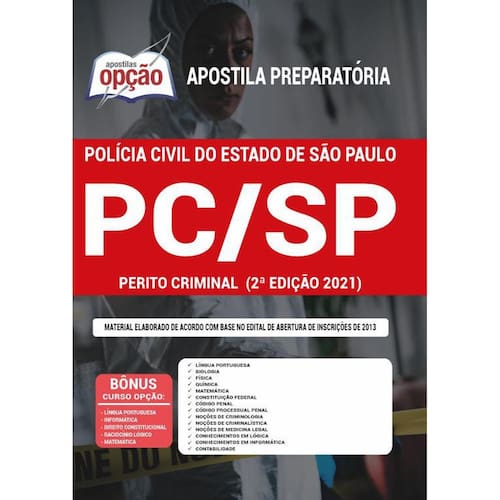 A Apostila Concurso PC-SP 2021 - Perito Criminal 2ª Edição contempla as seguintes matérias: Língua Portuguesa Biologia Física Química Matemática Constituição Federal Código Penal Código Processual Penal Noções de Criminologia Noções de Criminalística Noções de Medicina Legal Conhecimentos em Lógica Conhecimentos em Informática Contabilidade
