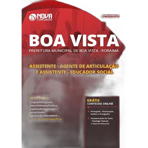 A Apostila Prefeitura de Boa Vista - RR 2019 - Assistente - Agente de Articulação e Assistente - Educador Social foi elaborada de acordo com o edital 001/2019, por professores especializados em cada matéria e com larga experiência em concursos.
