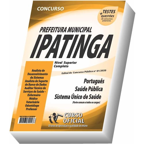 Edição Impressa Atualizada - Elaborada por professores especializados em concursos Públicos do Curso Oficial - São 20 anos de experiência e aprovação dedicados a você, . Cargos: Analista de Desenvolvimento de Sistemas - Analista de Suporte de Banco de Dados - Auditor Técnico de Serviços de Saúde - Enfermeiro - Enfermeiro - Médico - Veterinário - Odontólogo - Professor Tipo: IMPRESSA Páginas: 180 Escolaridade: ENSINO SUPERIOR COMPLETO Órgão: PREFEITURA MUNICIPAL DE IPATINGA - MG - EDITAL DE CONCURSO PÚBLICO Nº 001/2020 Conteúdo do Material: PORTUGUÊS SISTEMA ÚNICO DE SAÚDE / SAÚDE PÚBLICA Você receberá ainda: Testes, provas e questões de concursos anteriores; Atualizações, se houver alguma mudança no edital; Prova do último concurso; Edital do Concurso Marca: Não Informado Ean: 7898682123277