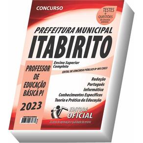 Edição Impressa Atualizada – Elaborada por professores especializados em concursos Públicos do Curso Oficial – São 23 anos de experiência e aprovação dedicados a você, candidato.Cargo: PROFESSOR DE EDUCAÇÃO BÁSICA PITipo: IMPRESSAPáginas: 226Escolaridade: ENSINO SUPERIOR COMPLETOÓrgão: PREFEITURA MUNICIPAL DE ITABIRITO-MG - EDITAL DE CONCURSO PÚBLICO Nº 001/2023 - EDUCAÇÃOConteúdo do Material:RedaçãoPortuguêsInformáticaTeoria e Prática da EducaçãoConhecimentos EspecíficosVOCÊ RECEBERÁ AINDA:Testes, provas e questões de concursos anteriores;Atualizações, se houver alguma mudança no edital;Prova do último concurso;Edital do Concurso.
