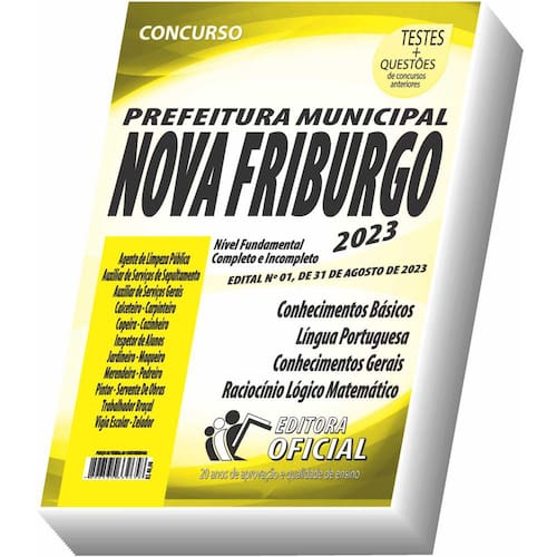 Cargos: Agente de Limpeza Pública - Auxiliar de Serviços de Sepultamento - Auxiliar de Serviços Gerais - Calceteiro - Carpinteiro - Copeira - Cozinheiro - Inspetor de Alunos - Jardineiro - Maqueiro - Merendeira - Pedreiro - Pintor - Servente De Obras - Trabalhador Braçal - Vigia Escolar - Zelador Tipo: IMPRESSA Páginas: 106 Escolaridade: NÍVEL FUNDAMENTAL COMPLETO E INCOMPLETO Órgão: PREFEITURA MUNICIPAL DE NOVA FRIBURGO/RJ - EDITAL Nº 01, DE 31 DE AGOSTO DE 2023