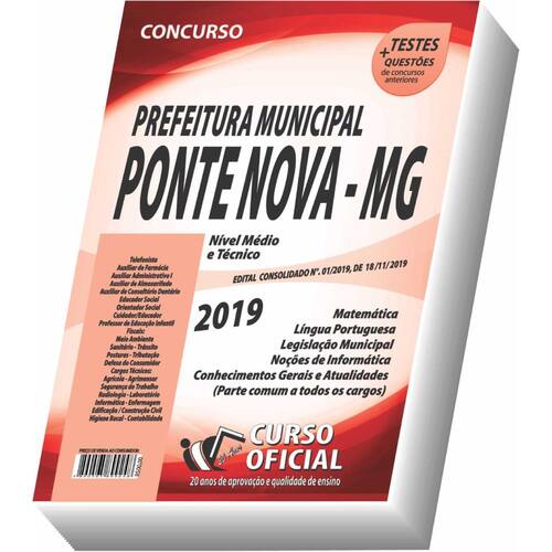 Edição impressa atualizada 2019 - elaborada por professores especializados em concursos públicos do curso oficial - são 20 anos de experiência e aprovação dedicados a você, . Cargos: telefonista - auxiliar de farmácia - auxiliar administrativo i - auxiliar de almoxarifado - auxiliar de consultório dentário - educador social - orientador social - cuidador/educador - professor de educação infantil - fiscais: Meio ambiente - sanitário - trânsito - posturas - tributação - defesa do consumidor - cargos técnicos: agrícola - agrimensor - segurança do trabalho - radiologia - laboratório - informática - enfermagem - edificação / construção civil - higiene bucal - contabilidade Tipo: impressa Páginas: 340 Edição: 2019 Escolaridade: nível médio e técnico completo Órgão: prefeitura municipal de ponte nova - edital nº 01/2019 Conteúdo do material: Língua portuguesa Legislação municipal Noções de informática Matemática e raciocínio lógico Conhecimentos gerais e atualidade Você receberá ainda: Testes, provas e questões de concursos anteriores; Atualizações, se houver alguma mudança no edital; Prova do último concurso; Edital do concurso. Marca: Não Informado