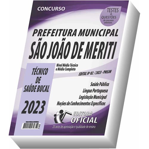 Cargo: TÉCNICO DE SAÚDE BUCAL Tipo: IMPRESSA Páginas: 224 Escolaridade: NÍVEL MÉDIO COMPLETO E NÍVEL MÉDIO TÉCNICO Órgão: PREFEITURA MUNICIPAL DE SÃO JOÃO DE MERITI - Estado do Rio de Janeiro - CONCURSO PÚBLICO 02/2023