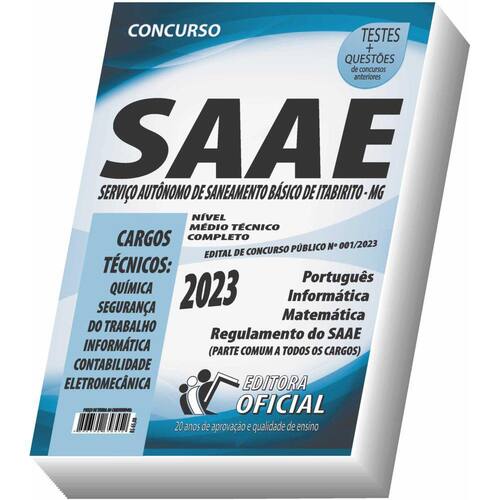 Cargos: Técnico de Contabilidade - Técnico de Eletromecânica - Técnico de Informática - Técnico de Química - Técnico de Segurança do Trabalho Tipo: IMPRESSA Páginas: 236 Escolaridade: ENSINO MÉDIO TÉCNICO COMPLETO Órgão: SAAE - SERVIÇO AUTÔNOMO DE SANEAMENTO BÁSICO - ITABIRITO-MG - EDITAL DE CONCURSO PÚBLICO Nº 001/2023