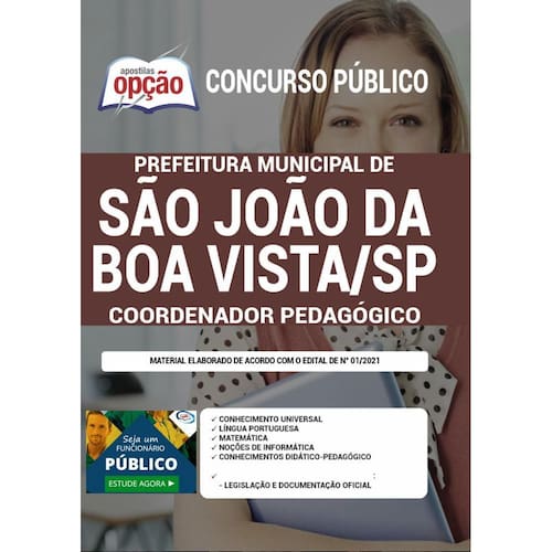 A Apostila Concurso Prefeitura de São João da Boa Vista - SP 2021 - Coordenador Pedagógico contempla as seguintes matérias: Conhecimento Universal Língua Portuguesa Matemática Noções de Informática Conhecimento Didático - Pedagógico Conteúdo Complementar e Exclusivo: Legislação e Documentação Oficia