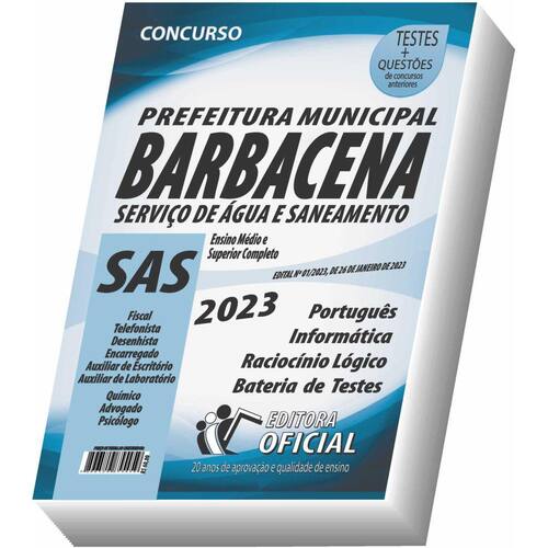 Cargos: fiscal - telefonista - desenhista - encarregado - auxiliar de escritório - auxiliar de laboratório Tipo: impressa Páginas: 232 Escolaridade: nível médio completo Órgão: serviço de água e saneamento - sas - processo seletivo público simplificado - edital nº 01/2023, de 26 de janeiro de 2023