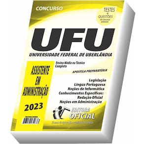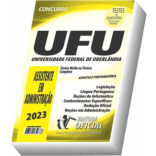 Edição Impressa Atualizada – Elaborada por professores especializados em concursos Públicos do Curso Oficial – São 23 anos de experiência e aprovação dedicados a você, candidato.Cargo: ASSISTENTE EM ADMINISTRAÇÃOTipo: IMPRESSAPáginas: 198Escolaridade: ENSINO MÉDIO OU TÉCNICO COMPLETOÓrgão: SERVIÇO PÚBLICO FEDERAL - MINISTÉRIO DA EDUCAÇÃO - UNIVERSIDADE FEDERAL DE UBERLÂNDIAConteúdo do Material:LegislaçãoLíngua PortuguesaNoções de InformáticaConhecimentos EspecíficosRedação OficialNoções em AdministraçãoVOCÊ RECEBERÁ AINDA:Testes, provas e questões de concursos anteriores;Atualizações, se houver alguma mudança no edital;Prova do último concurso;Edital do Concurso. Ean: 7898682125943