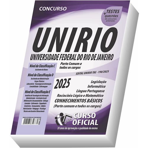 Edição impressa atualizada - elaborada por professores especializados em concursos públicos do curso oficial - são 25 anos de experiência e aprovação dedicados a você, . Cargos: nível de classificação c - assistente de alunos - nível de classificação d - assistente em administração - técnico de laboratório - técnico de tecnologia da informação - técnico em contabilidade - técnico em enfermagem - técnico em radiologia - nível de classificação e - administrador - analista de tecnologia da informação - assistente social - bibliotecário-documentalista - biólogo - contador - enfermeiro - engenheiro - estatístico - farmacêutico - médico - nutricionista - pedagogo - psicólogo - técnico em assuntos educacionais Tipo: impressa Páginas: 232 Escolaridade: nível médio, técnico e superior Órgão: unirio - universidade federal do estado do rio de janeiro - edital unirio tae - 190/2025 Conteúdo do material: Conhecimentos básicos Legislação Informática Língua portuguesa Raciocínio lógico e matemático parte comum a todos os cargos Você receberá ainda: Testes, provas e questões de concursos anteriores; Atualizações, se houver alguma mudança no edital; Prova do último concurso; Edital do concurso. Marca: Não Informado