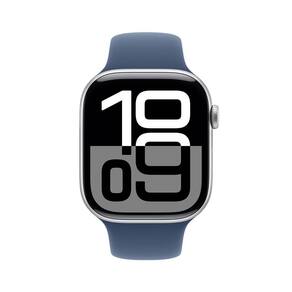Apple Watch Series 10 GPS com caixa prateada de alumínio de 46 mm e pulseira esportiva denim M/G. Equipado com processador S10 SiP de dois núcleos de 64 bits e Neural Engine de 4 núcleos. Possui 64 GB de capacidade. Tela Retina Sempre Ativa de LTPO3 OLED com amplo ângulo de visão, até 40% mais brilhante quando inclinada. Bateria para o dia todo (até 18 horas de uso normal, até 36 horas no Modo Pouca Energia). Sistema operacional watchOS 11. Resistência à água de 50m e resistência à poeira (IP6X). Compatível com iPhone XS ou posterior com iOS 18 ou posterior.Processador