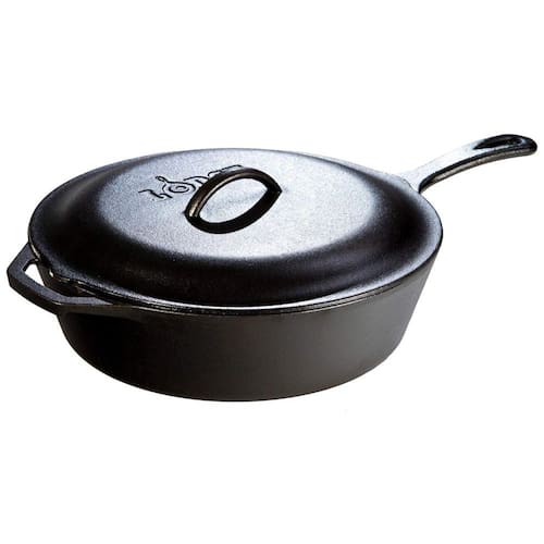 Frigideira profunda pré temperada de ferro fundido de 5 quart One Lodge Tampa de ferro fundido com pontas autolizantes Alça auxiliar para melhor controle Retenção de calor incomparável e até aquecimento Pré temperado com óleo vegetal 100 natural Use para selar, assar, grelhar, refogar, fritar ou grelhar Use no forno, no fogão, na grelha ou sobre uma fogueira Ótimo para cooktops de indução Marca: Não Informado