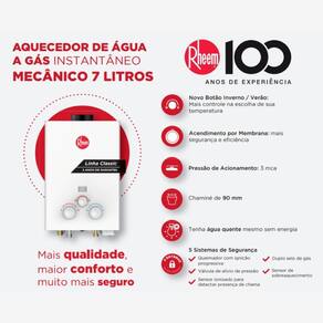 A linha de aquecedores de passagem digitais da Rheem são reconhecidos pela sua alta tecnologia. O aquecedor a gás Rheem de 7 litros GN Gás Natural é perfeito para quem busca um banho confortável e com controle de temperatura na medida certa. Com tecnologia avançada e acendimento por membrana, ele oferece segurança e qualidade Rheem, líder mundial no setor. Ideal para residências, apartamentos e espaços compactos, esse modelo garante água quente na hora que você precisa, com e assistência especializada em todo Brasil. Garanta o seu banho do jeito que você merece Com Capacidade de 7 litros/min e acendimento por membrana que deixa o aparelho mais seguro e eficiente, esse aquecedor tem um design compacto e moderno que conta ainda com Botão Inverno/Verão para um maior controle de temperatura no seu banho. Perfeito para ambientes com demanda de até 7 litros por minuto de água quente Importante: Antes de adquirir seu equipamento, tenha certeza de que sua estrutura de água e gás são compatíveis com o a capacidade do aparelho que está sendo adquirido. Características: Capacidade Delta T 20 C = 7 l/min Rendimento = 84% Consumo Máximo = 1.04 m/h Pressão de gás dinâmica = 200 mm.C.A Pressão de gás máxima = 250 mm.C.A Pressão Mínima de Água para Acionamento dinâmica = 3 m.C.A Pressão Máxima de Água = 100 m.C.A Temperatura máxima na entrada = 60 Cº Alimentação Elétrica DC = 2 Pilhas de 1,5 V Tipo D Diâmetro da Chaminé = 90mm Conexões para ligação do gás e água = 1/2 Polegada Tipo de Gás: GN Gás Natural Transforme seu banho em um momento de conforto e bem-estar com a qualidade Rheem, referência mundial em aquecimento de água há mais de 100 anos Marca: Não Informado