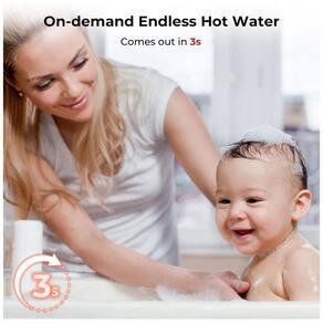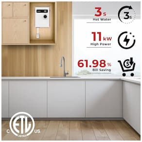 O elemento aquecedor é separado do tubo de água, reduzindo o acúmulo de calcário, corrosão e incrustações minerais. O gabinete compacto em acabamento branco possui conexão lateral de água, facilitando a instalação em espaços reduzidos como armários, banheiros, garagens e porões. A instalação é do tipo fixo na parede (hardwire), com conexão de água de 1/2" NPT. O produto é certificado ETL e possui proteção contra superaquecimento e desligamento automático quando não há fluxo de água detectado.