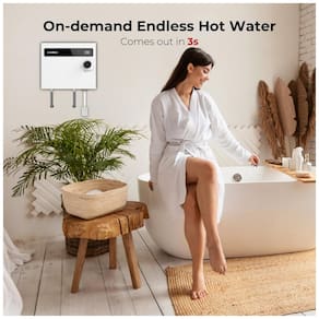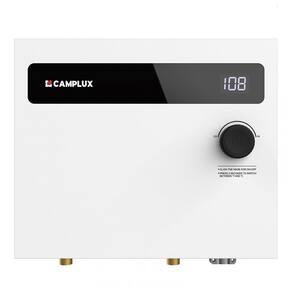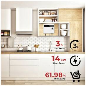 O elemento aquecedor é separado do tubo de água, reduzindo o acúmulo de calcário, corrosão e incrustações minerais. O gabinete compacto em acabamento branco possui dimensões reduzidas, sendo até 91,55% menor que aquecedores elétricos convencionais com reservatório, e é fixado na parede, sendo compatível com instalação em armários, banheiros, garagens e porões. A instalação é do tipo fixo na parede (hardwire), com conexão de água de 1/2" NPT. O produto é certificado ETL e possui proteção contra superaquecimento e desligamento automático quando não há fluxo de água detectado.