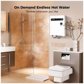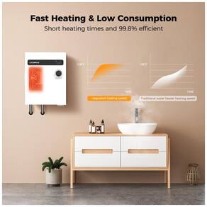 O elemento aquecedor é separado do tubo de água, reduzindo o acúmulo de calcário, corrosão e incrustações minerais. O gabinete compacto em acabamento branco é fixado na parede, permitindo instalação em espaços reduzidos. A instalação é do tipo fixo na parede (hardwire), com conexão de água de 3/4" NPT. O produto é certificado ETL e possui proteção contra superaquecimento, anti-aquecimento a seco e desligamento automático quando não há fluxo de água detectado.