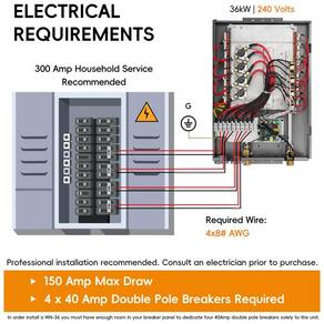 Recomenda quadro elétrico 300A; instalação exige eletricista qualificado com verificação de capacidade do sistema.