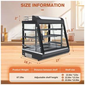 Ficha Técnica Especificação Detalhes Marca Whalefall Cor Preto Material Aço inoxidável, vidro temperado Potência 1200W Voltagem 110V Fonte de energia AC/DC Dimensões (C x L x A) 68,6 x 48 x 70,1 cm Peso do item 35,8 kg Capacidade suporte superior 30 kg Número de bandejas 3 Faixa de temperatura 21°C a 85°C Iluminação LED tri-cor (quente, branca, fria) Portas Deslizantes frontal e traseira Recursos Termômetro e termostato ajustável Marca: Não Informado
