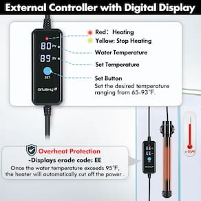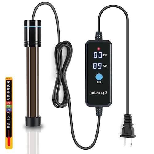 Orlushy Aquecedor submersível de aquário de 100 W, aquecedor de aquário ajustável com controle externo de exibição digital, proteção contra superaquecimento e termômetro para tanque de água doce e salgada de 10-20 galões - Orlushy Aquecedor de aquário de 100 W: o aquecedor Orlushy de 100 W funciona perfeitamente em tanques de 10 a 20 galões, adequado para aquários, aquários, tanques betta e tanques de tartaruga. O comprimento deste aquecedor é de 13,5 cm, que é mais compacto em tamanho do que o aquecedor autêntico, ocupando menos espaço e pode ser facilmente escondido no aquário. - Vidro de quartzo mais seguro e durável: este aquecedor de aquário é feito de vidro de quartzo cinza, que tem maior dureza do que o vidro de quartzo comum, mais resistente a altas temperaturas e à prova de explosão. Este material torna o aquecedor mais seguro e durável para ser utilizado em água doce e salgada, maior vida útil é fornecida. - Aquecimento rápido de água e sensor de água preciso: com fio de níquel-cromo premium enrolado uniformemente, o calor pode se dissipar rapidamente para uma área mais ampla na água, aquecimento de água mais eficiente. O sistema exclusivo de detecção de temperatura da água pode corrigir com precisão a temperatura da água em tempo real no valor definido, protegendo suas vidas aquáticas das flutuações da temperatura da água. Quando a temperatura da água exceder 35 °C, o aquecedor cortará automaticamente a energia e o código de erro "EE" será mostrado, eliminando o risco de "ferver peixe". - Controlador externo com display digital LED: o controle externo reduz o risco de entrada de água e queima o aquecedor, melhorando muito a segurança. O controle remoto permite que você ajuste o aquecedor sem ser feito na água e molhar à mão. A temperatura é ajustável variando de 18.3 °C a 33.9 °C, e o valor definido muda -17.2 °C por prensa. Além disso, você também pode observar a temperatura da água em tempo real no visor digital a qualquer momento. - Termômetro e garantia de 180 dias: Este aquecedor de aquário vem com um termômetro de tira livre para melhor calibrador de temperatura, bem como garantia de 180 dias de que a substituição do aquecedor é fornecida se ocorrer algum problema. Se você tiver algum problema com o aquecedor, sinta-se à vontade para entrar em contato conosco. Fornecemos um serviço pós-venda oportuno.