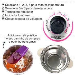 CERA MATIC JÚNIOR pertence à Linha CERA MATIC MEGA BELL, uma linha de aquecedores profissionais de cera em barra para depilação, com design moderno e diversas opções de cores. Derrete e armazena a cera na temperatura ideal. Nela, podem ser utilizadas ceras em tabletes ou granuladas, deixando o trabalho muito mais rápido e eficiente. Aquecedor profissional ou doméstico para cera de depilação. Equipado com termostato para regulagem de temperatura, indicador luminoso de funcionamento e chave seletora de voltagem. Seu corpo de ABS é resistente à altas temperaturas, e sua resistência blindada, a torna totalmente segura. INSTRUÇÕES DE USO: Antes de conectar o aparelho à tomada, verifique a voltagem correta (110V ou 220V) e ajuste a chave seletora que se encontra na parte de baixo do aparelho. Colocar a cera no recipiente, ligar o aparelho e ajuste o botão de temperatura entre 5 e 6 , até que a cera derreta. Quando a cera estiver derretida, posicionar o botão de ajuste de temperatura de acordo com a necessidade do trabalho. CUIDADOS E PRECAUÇÕES: Não ligue o aparelho sem cera no recipiente. Não aperte ou puxe o botão quando ligar ou regular a temperatura. Não use o aparelho em locais molhados. CAPACIDADE: REF. 03 COM REFIL: 400g REF. 01 SEM REFIL: 400g A OPÇÃO COM REFIL (PANELINHA DE ALUMÍNIO) É INDICADA PARA FACILITAR A HIGIENE DA TERMOCERA E AUMENTAR A DURABILIDADE DA MESMA.