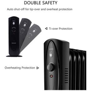 OPERAÇÃO FÁCIL E DESEMPENHO PERFEITO Use o único botão incluído para ajustar a temperatura de aquecimento. Operação totalmente silenciosa sem preocupação com ruídos indesejados. MELHOR PARA ESPAÇOS PEQUENOS O aquecedor com saída de calor de 700 watts e controle de termostato é a melhor escolha para salas pequenas e médias em clima frio. FÁCIL DE ZENAR E CARREGAR Com sua alça de transporte e peso leve, é fácil de transportar de sala em sala tamanho mini e design compacto também permitem fácil zenamento sazonal. COMO FUNCIONA Irradia calor por óleo endotérmico especial permanentemente selado, mas o gabinete de folha de metal de calibre pesado garante a segurança