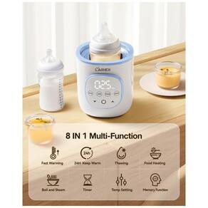 O equipamento conta com função descongelamento, aquecimento de alimentos em potes, esterilização com vapor a 100°C para frascos, bicos e acessórios, além das funções de manter quente e ajuste personalizado. O sistema é compatível com mamadeiras de pescoço largo, estreito, angulado e potes de papinha em diversos materiais. O aviso sonoro ao final do ciclo e desligamento automático garantem segurança durante a operação.