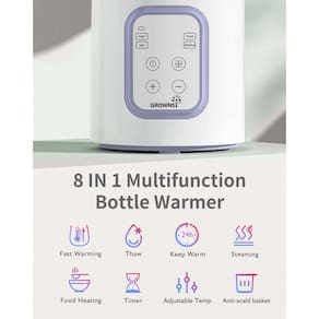 aquecedor de garrafas - ?Aquecimento rápido em 3 minutos?: 120 ml de leite leva apenas 3 minutos para chegar a 37 °C. Aquece rápido o suficiente para acalmar um bebê gritando no meio da noite. Bebê feliz significa mamãe feliz! (*O tempo de aquecimento depende do volume do leite, temperatura inicial e material da garrafa.) - ?Aquecedor de mamadeira inteligente 8 em 1?: aquecimento rápido/descongelamento/mantém aquecido/aquecimento de alimentos/temporizador/temperatura ajustável/cesta antiqueimaduras. Economize dinheiro com outros dispositivos volumosos e inúteis. Esta máquina de fazer tudo atende a todas as suas necessidades. É o melhor presente de banho para famílias em crescimento. - ?Perfeito para alimentação noturna?: Use a função Keep Warm para manter a temperatura do leite antes de ir para a cama (seu tamanho pequeno cabe facilmente em uma mesa de cabeceira) para aquelas mamadas tarde da noite. Também é muito útil ao tentar fazer seu bebê pegar uma mamadeira e pode experimentar uma mamadeira várias vezes com espaços curtos entre eles. - ?Desligamento automático?: o aquecedor de mamadeira desliga automaticamente com temporizador quando o leite estiver pronto. Troque seu bebê e volte e pronto! Nunca se preocupe com superaquecimento e é bom para manter a nutrição do leite. - ?Escolha de milhões de mães?: O aquecedor de mamadeira Grownsy foi escolhido por mais de 9.000.000 pais. Com a missão de: cuidar e nutrir cada passo do crescimento, continuaremos a apoiar mais famílias. Adicione à sua lista de presentes ou dê de presente para alguém de quem você gosta e deixe a Grownsy fazer o resto.