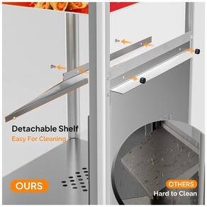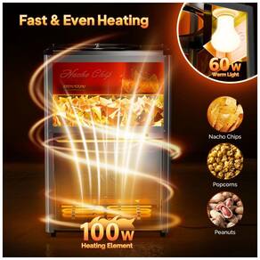 O Aquecedor de Nachos ROVSUN é um equipamento de bancada em aço inoxidável resistente à corrosão com vidro temperado espesso, projetado para manutenção térmica de nachos, pipoca e amendoins em quiosques, cinemas, estádios e eventos comerciais. A base de aquecimento de 100 W combinada com lâmpada de aquecimento de 60 W proporciona operação rápida, enquanto o design de carregamento superior com tampa em aço inoxidável e defletor removível evita danos durante abastecimento. Controles de um botão simplificam a operação, com porta frontal e colher em aço inoxidável para porcionamento eficiente. ?