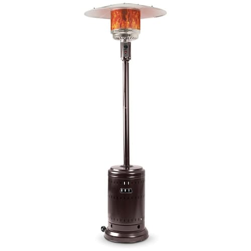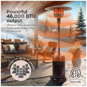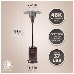 Acabamento durável, revestido a pó Potência de calor de 46.000 BTUs Ignição piezoelétrica Válvula de segurança de desligamento automático de segurança Montagem da roda incluída Mede aproximadamente 45 x Havana Bronze Color observe que enquanto o produto pode aparecer Carvão vegetal Cinza à sombra, a luz solar revela a rica textura de bronze Prenda o aquecedor quando não estiver em uso para evitar qualquer dano potencial
