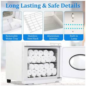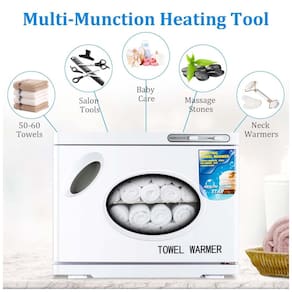 Aquecedor de toalhas quentes 2 em 1Com design de aquecimento e iluminação, o nosso aquecedor de toalhas quentes não apenas aquece as toalhas, mas também pode ser para aquecer toalhas de banho, compressas quentes, aquecedores de pescoço, pedras de massagem e outros utensílios. É ideal para banheiros, spas, salões de beleza, massagens, academias, hotéis e uso doméstico