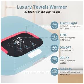 Aquecedor de Toalhas Multifuncional para Banheiro: Com 3 modos de aquecimento (20/40/60 minutos) e função de atraso de até 24 horas, permitindo reservar o aquecimento com antecedência. Quando o aquecimento é concluído, a toalha atinge uma temperatura confortável para o corpo humano, sem queimar a pele. O display LED exibe a temperatura real e o tempo restante de aquecimento.