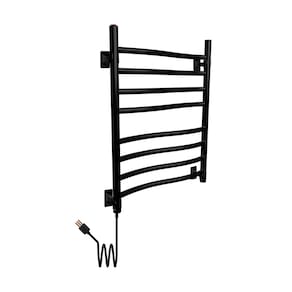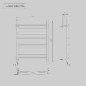 Dimensões: 54,5 cm x 70 cm x 9,2 cm (LxAxP) Peso: 5 kg Acabamento: Preto Fosco Material: Aço Voltagem: 220v N° de barras: 8 barras curvas redondas Potência: 95w Resistência fio resistivo Lado do fio: Esquerdo na parte inferior do toalheiro Marca: Seccare Garantia: 3 anos pelo fabricante
